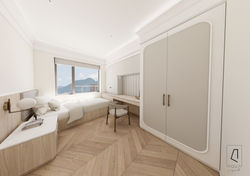 The master bedroom headboard finish combines decorative mouldings with wooden-toned back panels, infusing a warm wooden texture; the wardrobe finish uses light gray faux fabric wallpaper to enhance the overall layering and quality.