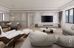 客飯廳以米色調為主,鋪設魚骨紋木地板,牆身與天花以花線點綴,融入多款特色雲石;儲物櫃運用圓角設計,視覺更流暢自然。